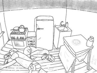 Я подхожу к мужику, беспомощно валяющемуся на моём потрескавшемся линолеуме. Он успел спихнуть с себя напарника, и дрожащими руками начинает что-то искать у себя за пазухой. Его модный голубоватый пиджак, с белой строчкой на швах, измазан кровью. Его идеально выглаженные брюки успели впитать литры багровой жидкости и потемнеть. Он был весь измазан кровью. Чёрные глазёнки уставились на меня, застыв от порыва холодного ужаса. Ужаса, сжавшего его губы тонкой ломанной линией. Сейчас он напоминает мне новорождённого младенца, оставленного на грязном, покрытом тонким слоем пыли ковре, в квартире, чудом уцелевшей после очередного обстрела.