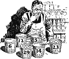 Часть этих корзин содержит куриные, часть — утиные яйца. Продавец говорит: «если я продам все яйца из этой корзины, в оставшихся яйцах на два куриных придется одно утиное яйцо». Число яиц написано на каждой корзине. Какую из них торговец должен продать, чтобы произвести свой опыт? (Ответ см. ).