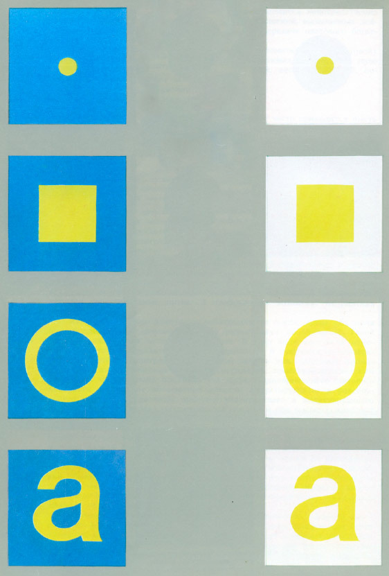 К этим стимулам следует еще добавить зависимость эффекта контраста от формы реагирующего поля: круг или кольцо, квадрат или буква на одном и том же фоне в равных условиях будут сопровождаться различной силы контрастом. Далее, если мы имеем два рядом расположенных пятна, которые не относятся между собой как фигура и фон, то контраст, который они вызывают, образуется не по принципу субординации, а по принципу равного взаимодействия.