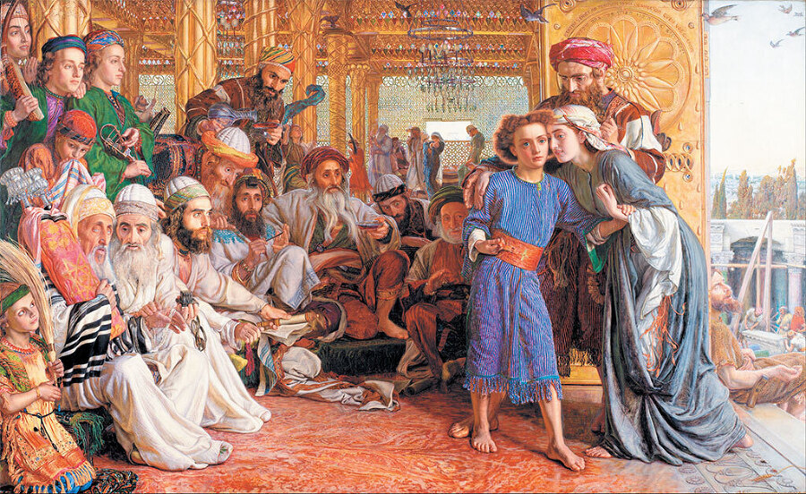 Другое значительное произведение из библейского цикла Поленова «Среди учителей» ближе всего полотну «Родители находят юного Иисуса в храме». Картина Ханта также исполнена под впечатлением от первой поездки в Иерусалим в 1854–1856 годах, на основе натурных зарисовок.