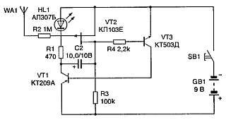 Транзистор VT1 может быть серии КТ209 (с индексами А-Е) или КТ361 VT2 — любой из серии КП103, VT3 — любой из серии КТ315, КТ503, КТ3102. Резистор R1 может быть сопротивлением 150…560 Ом, R2 — 50 кОм.1,2 МОм. R3 и R4 — с отклонением от указанных на схеме номиналов на 15 %, конденсатор С1 — емкостью 5…20 мкФ.