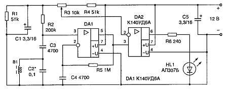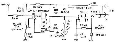 При расположении антенны WA1 вблизи от токонесущего провода электросети наводка ЭДС промышленной частоты 50 Гц усиливается микросхемой DA1, в результате чего зажигается светодиод HL1. Это же выходное напряжение операционного усилителя, пульсирующее с частотой 50 Гц, запускает генератор звуковой частоты.