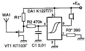 Простой индикатор переменного электрического ноля скрытой проводки может быть собран с использованием в качестве регулируемого внешним электрическим полем делителя напряжения — резистора R1 и канала полевого транзистора (рис. 3.21). В качестве управляемого генератора импульсов использован генератор на микросхеме К122ТЛ1. Нагрузкой генератора для индикации являются высокоомные головные телефоны тина ТОН-1 (ТОН-2).