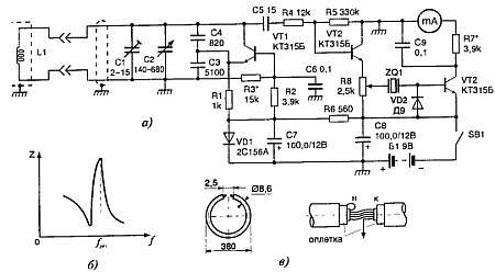 Металлоискатели, основанные на регистрации на биений, оказываются малочувствительными при поисках металлов со слабыми ферромагнитными свойствами, таких как, например, медь, олово, серебро. Повысить чувствительность металлоискателей этого типа невозможно, поскольку разность частот биения малозаметна при обычных методах индикации. Значительный эффект дает применение кварцованных металлоискателей. Металлоискатель, принципиальная схема которого приведена на рис. 4.17,а, состоит из измерительного генератора, собранного на транзисторе VT1, и буферного каскада — эмиттерного повторителя, собранного на транзисторе VT2, отделенных кварцевым резонатором ZQ1 от индикаторного устройства — детектора на диоде VD2 с усилителем постоянного тока на транзисторе VT3. Нагрузкой усилителя служит стрелочный прибор С током полного отклонения 1 мА.