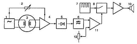 1 — генератор (3 кГц); 2 — дискриминатор; 3 — катушки металлоискателя; 4 — усилитель высокой частоты; 5 — детектор; 6 — фильтр низких частот; 7 — звуковой генератор; 8 — электронный ключ звукового сигнала; 9 — усилитель выходных сигналов; 10 — громкоговоритель; 11 — схема сравнения; 12 — регулируемое опорное напряжение